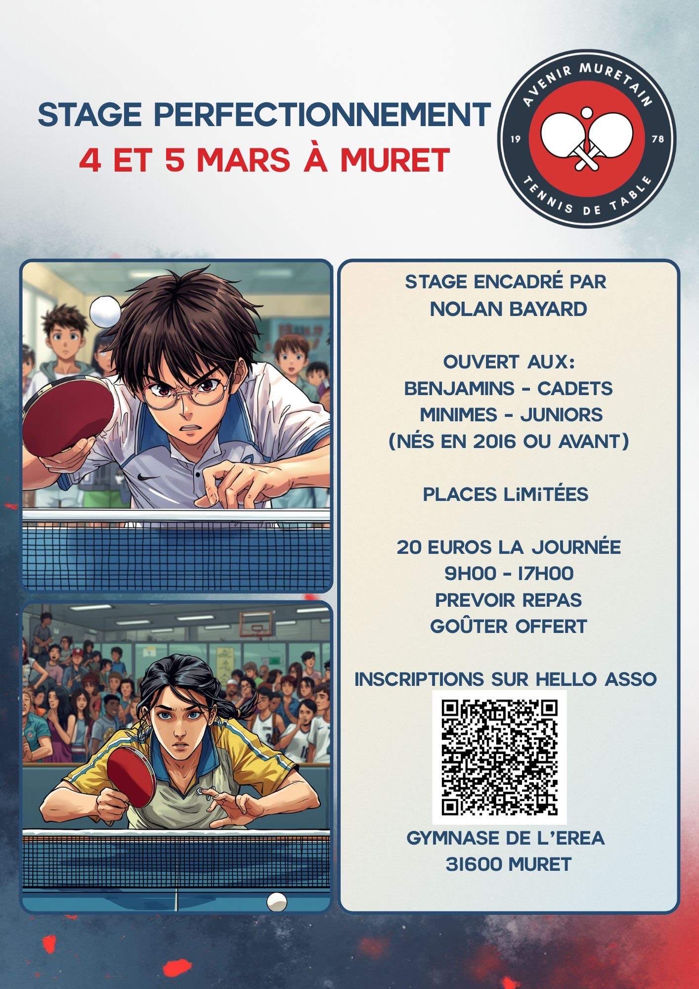 Infos des clubs Plusieurs informations issues des Clubs : Stages d’hiver (23 au 27 février) du club de l’ASPTT : accès aux informations Stages d’hiver (23 au 27 février – 2 au 6 mars) du club de Pins-Justaret Villate tennis de table : accès aux informations (fichier zippé) Stages de perfectionnement jeunes (4 et 5 mars) du club Avenir Muretain : accès aux informations Perfectionnement ou jeu libre dans le club de l’ASPTT – samedi après-midi : accès aux informations Stage Féminin (27 mars) au club de de Tennis de Table TT Frouzinois : accès aux informations et à un questionnaire Zoom sur :